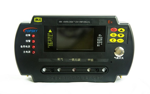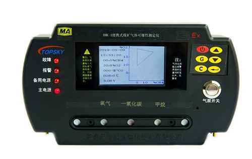 BMK-A便攜式煤礦氣體可爆性測定儀(以下簡稱測爆儀),是用于煤礦井下使用的礦用本安兼隔爆型攜帶式儀器。測爆儀用于煤礦井下,由礦山救護隊員攜帶進入災區,監視作業環境周圍氣體組份是否存在爆炸危險。也可由消火人員攜帶,在處理自然發火或啟封火區過程中,檢測周圍環境或密閉內空氣中甲烷、氧的濃度值,在儀器液晶顯示屏上直接顯示出O2、CH4、CO的濃度值和環境溫度值,并顯示出“爆炸三角形”的圖形及各氣體組份所構成的坐標點,臨近或達到警界限時儀器同時發出聲、光警報。