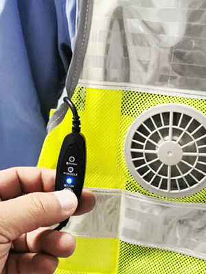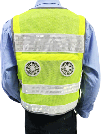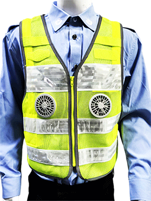 溫控警用背心(低溫型)為前開襟馬甲式樣,開襟用拉鏈拉開,前后身分別具有兩道橫向反光帶;前身胸部左右分別綴釘胸微、警號錦絲搭扣帶絨面、對講機袢、前后身兩側用錦絲搭扣及銅制四合扣連接,針對不同腰圍三檔調節肥瘦;可根據不同身高調節長短