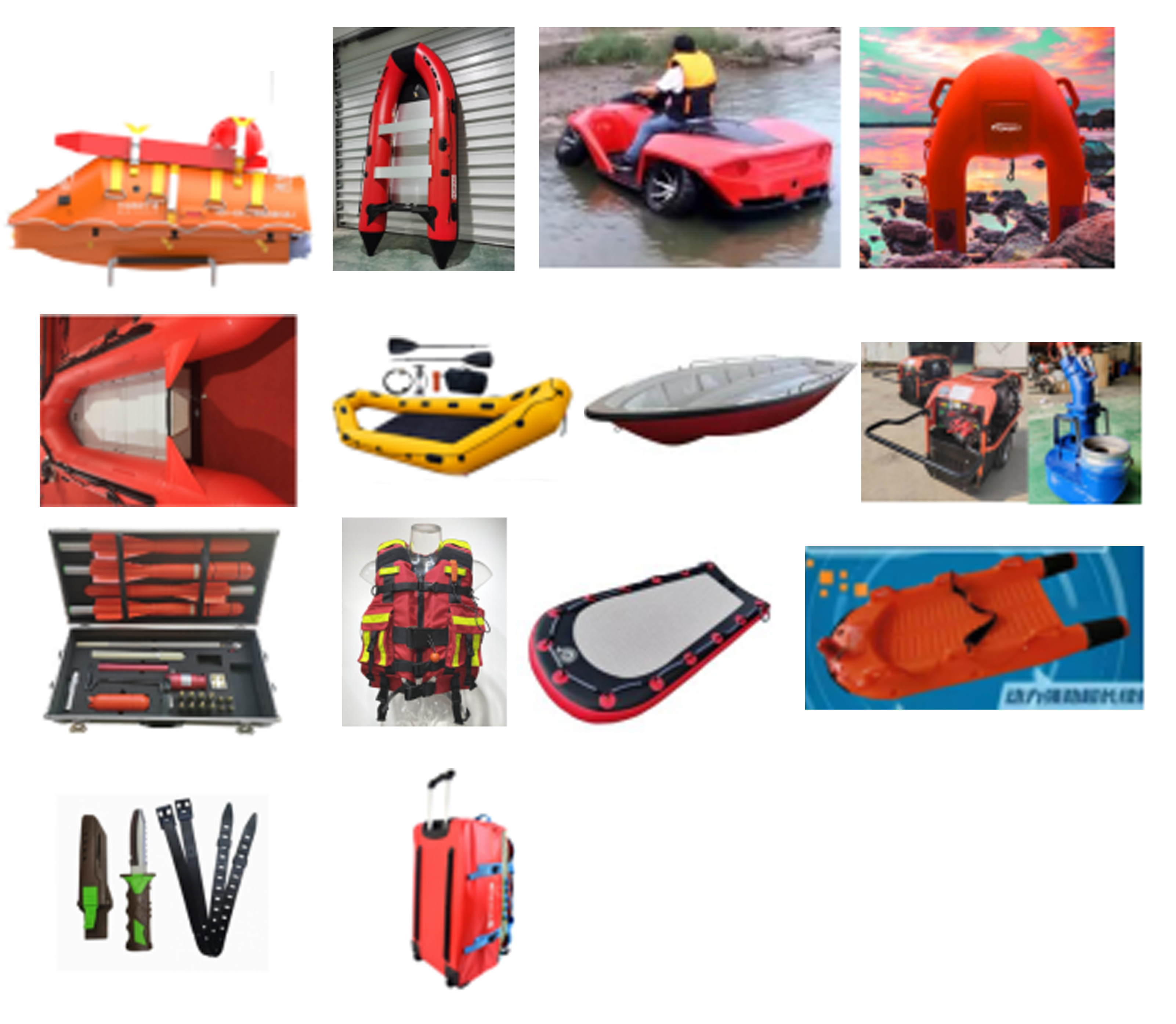 用于溺水、內澇事故救援及孤島轉移等任務,可選配超淺水充氣救援船、水 面無人救援艇、水陸兩用救援艇、充氣式救援筏、皮劃艇、沖鋒舟、便攜式 液壓抽水泵、救生拋投器、遙控救生器、救生衣、水上救生浮板、水上救援 擔架、割繩刀、便攜式救援包等。