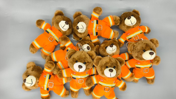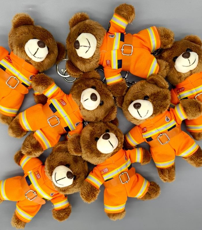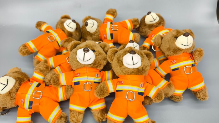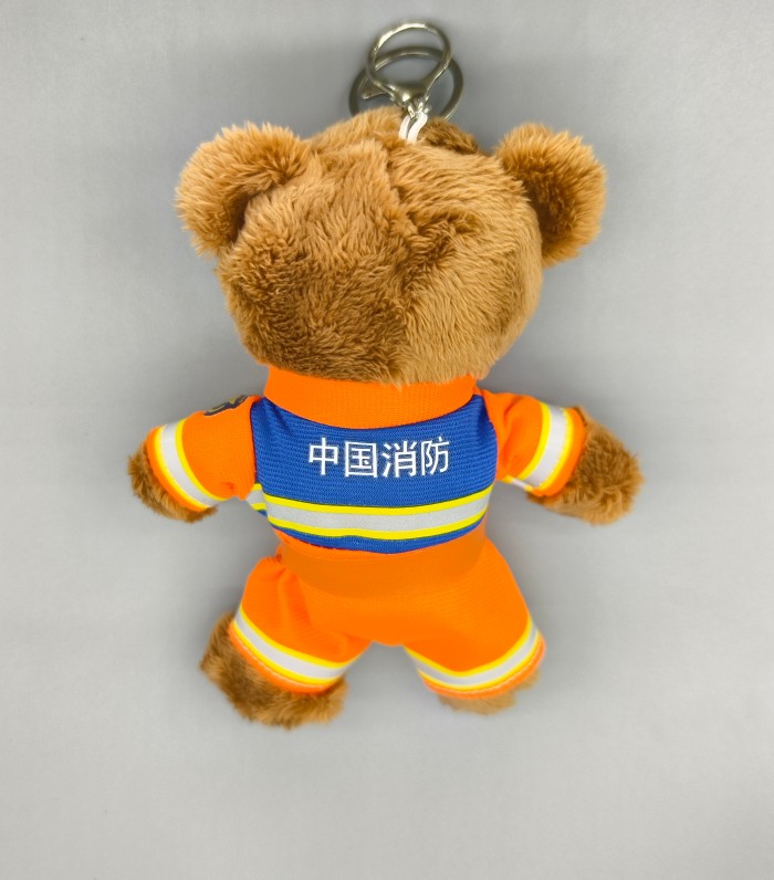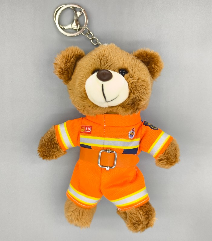 以消防員為原型定制的行業毛絨玩具熊掛件,兼具趣味性和實用性,可在多種場景掛載裝飾
